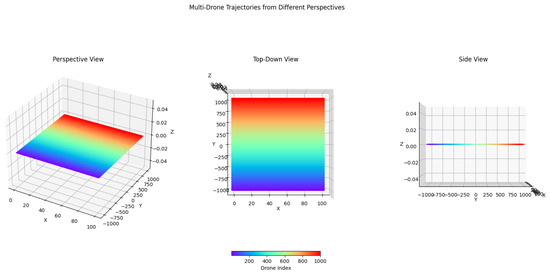 - Reward: The reward function of our task is designed to encourage the drones to navigate through assigned waypoints while avoiding collisions efficiently. The reward balances immediate positional goals with broader flight characteristics. The primary component, , uses an exponential decay based on the squared Euclidean distance to the current waypoint, providing a continuous gradient that intensifies as the drone approaches its target:The distance reward is complemented by , a binary reward triggered when the drone is within a tight threshold of a waypoint, offering a substantial bonus for precision:The reward function also incorporates a velocity-based reward. to encourage the drone to maintain moderate speeds with a peak reward at 0.5 units per time step, while and the corresponding penalty work in tandem to promote smooth rotational movements and discourage erratic changes in orientation:To address long-term objectives, provides a significant reward upon completing the entire set of waypoints, motivating the drone to navigate efficiently through the full course. The careful tuning of temperature parameters allows for fine adjustment of each component’s influence and enables the reward function to be adapted to various mission profiles and drone capabilities. The reward function ensures that the drone reaches the waypoints and has a flight pattern that is efficient, stable, and suitable for real-world applications:
