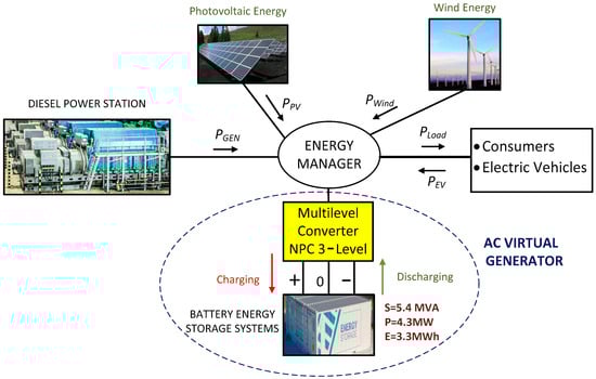 The NPC multilevel converter capacitor balance issue can be used to ease the battery management system (BMS), and therefore it is the considered converter to interface the Porto Santo battery-based ESS to the island grid (Figure 2), performing as an AC virtual generator while controlling the charge and the discharge of the battery.