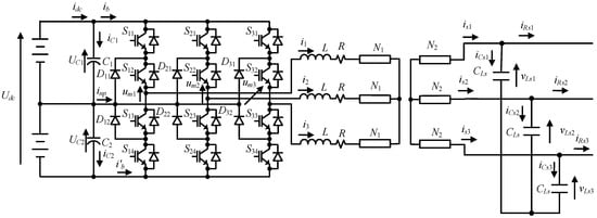 Assuming ideal components, AC grid voltages , , , dynamics in (13) can be obtained applying Kirchhoff laws to the filter capacitors of the multilevel converter in Figure 3, where i1, i2, i3 are the converter injected currents and iRs1, iRs2, iRs3 are the output MV line currents.