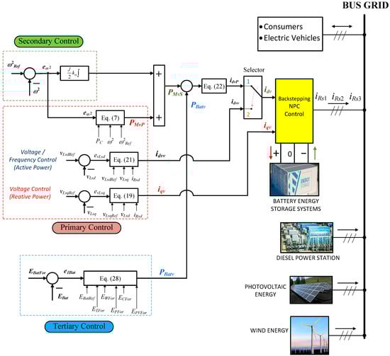 The BESS backstepping energy management completes the secondary and primary controllers in Figure 4.