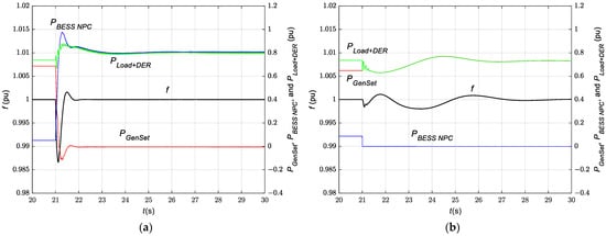 The results in Figure 5a show that when the grid frequency control is maintained by the BESS NPC, and the GenSet is disconnected from the grid at 21 s, the grid frequency has a reduction of 0.0125 pu and recovers in approximately 0.5 s. The power results show that when the GenSet is turned off, the BESS NPC starts to supply power to feed the load, controlling the frequency.
