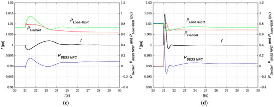 Steady-state behavior, of frequency and power, followed by the connection or by the disconnection of the GenSet or the NPC converter: (a) frequency control using the BESS NPC while the GenSet is disconnected from the grid at 21 s; (b) frequency control using the GenSet while the BESS NPC is disconnected from the grid at 21 s; (c) frequency control using the GenSet while the BESS NPC is connected to the grid at 21 s; (d) frequency control using the BESS NPC while the GenSet is connected to the grid at 21 s.
