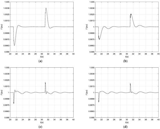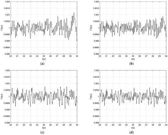 Microgrid frequency in pu under 0.05 pu random load variation: (a) GenSet only; (b) GenSet and BESS NPC primary control; (c) BESS NPC primary and secondary control; (d) BESS NPC and GenSet primary control.