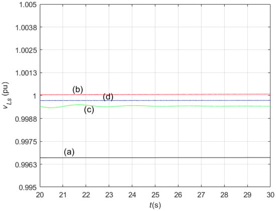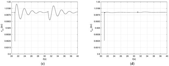 Microgrid voltage transient behavior from steady-state to step connection of 0.125 pu load at 21 s and disconnection at 31 s: (a) using GenSets only; (b) using both GenSets and BESS NPC tracking the voltage q component; (c) using the BESS NPC tracking the voltage q component; (d) using the BESS NPC tracking the dq voltage components.