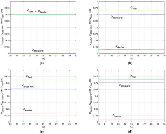 GenSet, BESS NPC, and Total reactive power in steady state: (a) Using GenSets only; (b) Using both GenSets and BESS NPC tracking the voltage q component; (c) Using the BESS NPC tracking the voltage q component; (d) Using the BESS NPC tracking the dq voltage components.