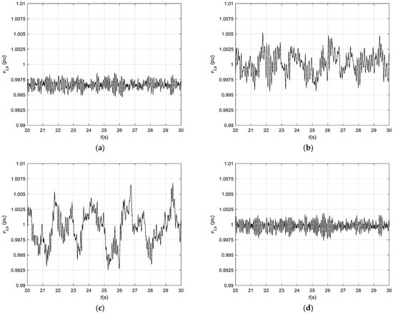 The results in Figure 10c point to an average voltage value of the microgrid of about 0.9995 pu, with variations around this value that can briefly exceed 0.005 pu. The BESS NPC, when giving priority to frequency control, causes an increase in voltage variation. Using the BESS NPC dedicated to microgrid voltage control, it is observed in Figure 10d that the average voltage value is approximately 0.99975 pu with voltage deviations in the order of 0.00125 pu.