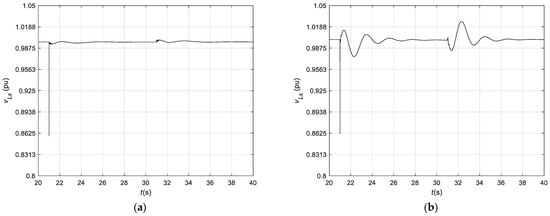 Figure 11a shows the microgrid voltage results when the grid operates with the GenSet but without the BESS NPC. When a 0.125 pu step load is connected at 21 s, a very brief voltage dip is observed. The microgrid voltage drops to 0.8625 pu, corresponding to a deviation greater than 0.1375 pu. After a rapid voltage recovery, slight oscillations of 0.00313 pu occur for 4 s. At the time of 31 s, the 0.125 pu load is switched off, and oscillations on the order of 0.00313 pu occur, lasting also about 4 s. When connecting the BESS NPC together with the GenSet, it can be seen in Figure 11b that when the load of 0.125 pu is connected, the voltage drops to 0.8625 pu and then recovers to 1 pu, presenting damped oscillations with an amplitude of 0.01565 pu, attenuated over a time interval of 7 s. At a time of 31 s, the 0.125 pu load is switched off, causing oscillations with an amplitude slightly greater than 0.01565 pu, which attenuate during 7 s.