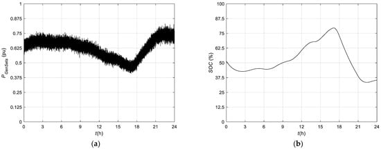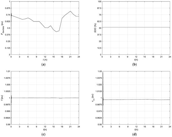 Figure 12a shows that the GenSet delivers approximately 0.4 pu minimum power around 4 p.m. and approximately 0.8 pu maximum power at 9 p.m. Therefore, the GenSet power is quite variable throughout the day, with 0.4 pu maximum variation. Additionally, from 6 p.m. onwards there is a significant power demand, while between 0 a.m. and 4 p.m. consumption decreases. During this test, the energy in the battery bank is kept constant, thus the battery SOC value, Figure 12b, remains constant. Figure 12c shows that the network frequency is well regulated by the GenSet at around 1 pu and the grid voltage has a value of approximately 0.9975 pu (Figure 12d).