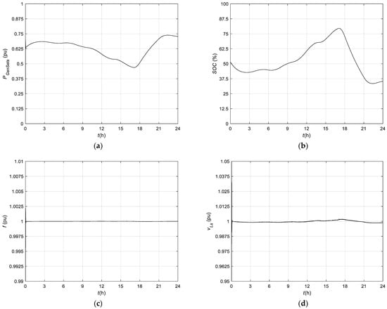 Using the battery backstepping power management with set limits on battery SOC, the GenSet power graph in Figure 13a shows that the minimum power rises to 0.475 pu at 17:00, while the maximum power drops to 0.7375 pu (at 22 h), meaning a reduced 0.2625 pu GenSet power variation. Relating the GenSet power without battery power management (Figure 12a) with the GenSet power in Figure 13a, it is seen that the GenSet power decreases only to a minimum value of 0.475 pu, while the battery SOC evolution in Figure 13b increases between 6 a.m. and 4 p.m., the lower power demand time span. After that time, the battery starts discharging after 4 p.m., when demand increases. Therefore, the backstepping energy management stores energy during lower demand to deliver it during increased demand, reducing the GenSet power variation and optimizing its operation while maintaining some energy reserve from RES. Figure 13c shows that the frequency control tracks the 1 pu reference, together with the microgrid voltage (Figure 13d), that follows the 1 pu reference with small variations throughout the day.