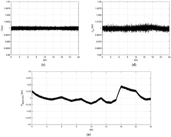 Figure 14e shows the BESS NPC active power, which is positive when the BESS NPC is using the stored energy to inject power in the microgrid. The BESS NPC active power is negative when charging batteries. Power variations due to the random disturbances are around 0.0375 pu.