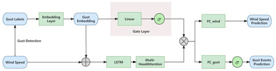 To further adjust the output of the attention mechanism, we introduce a gating mechanism. The role of the gating mechanism is to modulate the impact of the attention output based on the gust embedding . Through gating weights , the model can dynamically adjust the prediction results according to the gust state. The gating weights are computed as in (8).