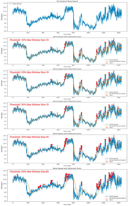 where is a scaling factor and is the standard deviation of wind speed over the previous time steps. A detected peak is classified as a gust if the wind speed difference exceeds the dynamic threshold: