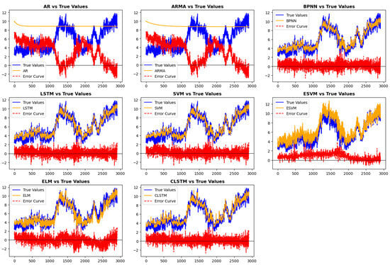 In the Low wind speed interval (3–6 m/s), CLSTM’s MSE and MAE are 0.38 and 0.48, respectively, which is the best performance among all models. The MSE for AR and ARMA is 21.14 and 21.45 and the MAE is 4.52 and 4.54, significantly higher than the other models, indicating that these two traditional models still perform poorly under low wind speed conditions. The MSE and MAE for BPNN, LSTM, and SVM are 0.42, 0.38, and 0.41 and 0.50, 0.48, respectively, showing similar performance. The MSE for EMD-SVM is 1.09 and the MAE is 0.91, while the MSE for ELM is 0.48 and the MAE is 0.55. Although EMD-SVM performs well in very low wind speed conditions, it begins to perform poorly under low wind speed conditions.