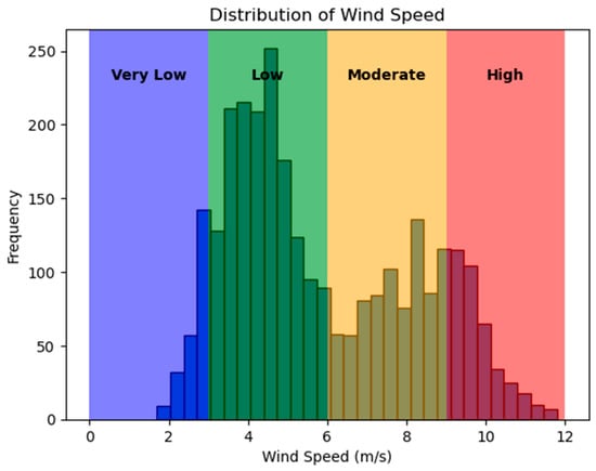Wind speed distribution in Testset. Dividing into four wind speed intervals of equal width allows for testing all model performances under different wind conditions.