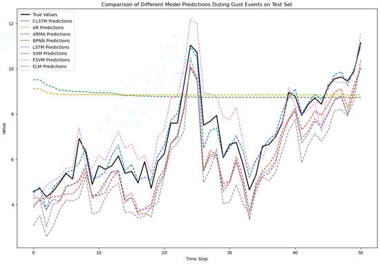 Predicted values of each model during gust points. It is evident that CLSTM is the closest to the true values at gust points and occasionally makes predictions that are higher than the actual values.