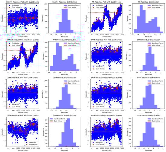 However, in non-gust periods, the performance of CLSTM is relatively inferior. Although its mean residual is −0.1784 and the standard deviation is 0.7053, this does not demonstrate a significant advantage, as the differences compared to other models are not substantial. For instance, the mean residual for BPNN is −0.2035 with a standard deviation of 0.7036, LSTM has a mean residual of −0.155 and a standard deviation of 0.7066, and SVM shows a mean residual of −0.1303 with a standard deviation of 0.7312. These values indicate that the predictive capabilities of these models in non-gust conditions are relatively similar.