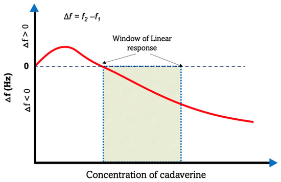 Subsequently, a resonance frequency shift deemed the maximum safe shift () was determined using a combination of the mathematically modeled MC response and experimental exposure of a functionalized PD-MC to increasing concentrations of cadaverine (1.5-diamino pentane, NH₂(CH₂)₅NH₂) concentrations ranging from 50 µL/L () to 245 µL/L (), and the resulting resonance frequency shifts were recorded, using the set-up described in [3], and depicted in Figure 5. The PD-MCs were functionalized by the method of drop casting, using a set-up described in [23].