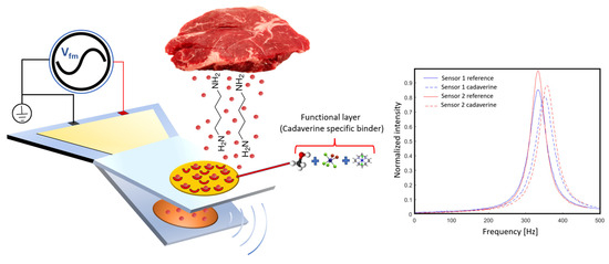 As stipulated earlier, cadaverine concentration is determined through the measured change in resonance frequency of the functionalized PD-MC. The PD-MC in the device is actuated by applying a driving signal, which consists of a sinusoidal voltage with a frequency range that spans the measured resonance frequency of the functionalized PD-MC. A sweep of the driving signal is performed both before and after exposure, and the resulting change in resonance frequency is recorded. Figure 2 illustrates the measurement principle, as described in our previous studies [2,8].