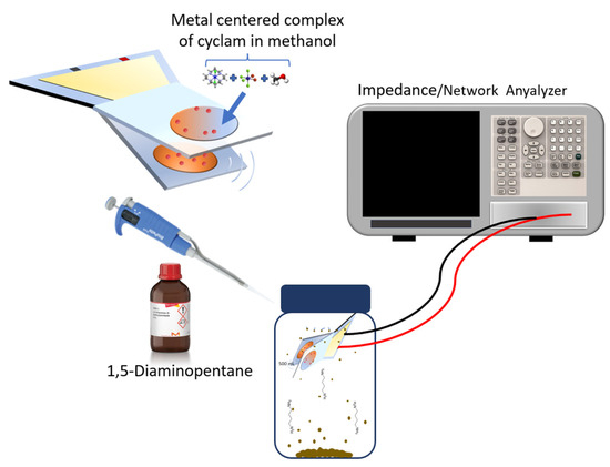 To ensure adherence to sensor surfaces, the metal–cyclam complex is combined with a modified form of cyclam (1,4,8,11-tetraazacyclotetradecane), wherein a pair of the quartet amine moieties inherent to the macrocyclic structure of cyclam have been substituted. This modification results in a viscous oil, which, when dissolved in methanol, forms a sticky and viscous solution suitable for application as a functional material on the sensor surface [3].