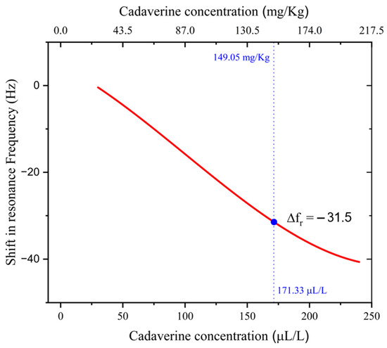 Figure 6 shows the parameterized response of the PD-MCs when exposed to varying concentrations of cadaverine. The was determined to be −31.5 Hz, corresponding to a concentration of 171.33 µL/L (149.05 mg/kg).