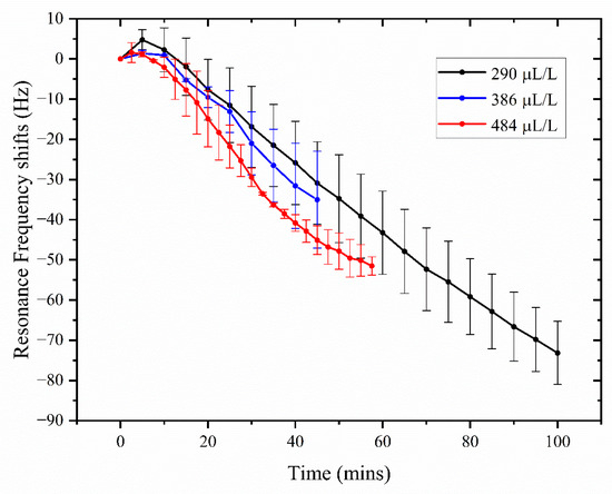 This study’s findings further emphasize the significance of the functionalized PD-MCs’ exposure time to the analyte. Longer exposure times result in larger resonance frequency shifts.