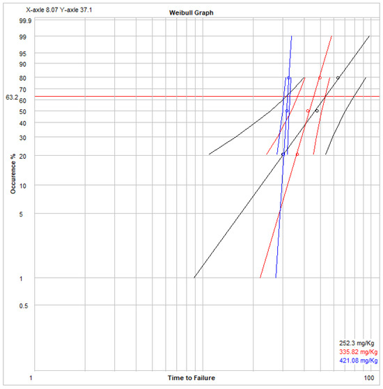 The Weibull parameters (time at 63.2% cumulative percentage) and (curve slope) were extracted from the Weibull reliability distribution plot (Figure 8) and are shown in Table 2. The goodness of fit to the Weibull 1-parameter was tested with the Kolmogorov–Smirnov method [36] and found to be within the 95% confidence limits.