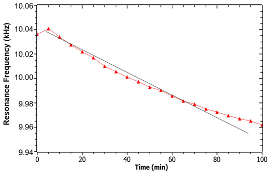 The failure mode was considered reached when the resonance frequency shift was larger in magnitude than and the parameterized response curve appeared to start deviating from the linear trend (see Figure 6).