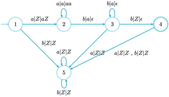 In this example, we have five states, and the stack alphabet Γ = {a, Z}. The elements of the stack alphabet and ε are represented as follows: