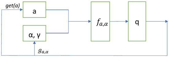 We begin with the yield relation C1 ⊢ C2, where C1 = (q, aw, ), C2 = (p, w, ), a ∈ ( ∪ {ε}), w ∈ , ∈ (Γ ∪ {ε}), and γ , as defined earlier. The yield determines the transitions based on the transition rules defined by the PDA depending on three variables: the control state p, the input symbol (or ε), and the top stack symbol of the stack instance. We will redefine the configurations based on the alternate view of the transition function we described above to distinguish the current stack top as a distinguishable entity. This does not change the computation sequence and hence does not impact the language defined. We define the configuration as (q, α, aw, γ), where q is the current state, α is the current stack top, aw is the remaining input to the process, and γ is the current stack. If C1 = (q, , aw, ) and C2 = (p, , w, ), we say C1 ⊢ C2 if and only if there are maps fa,α:q → p and ga,α: γ → . This view of the configuration change is shown in Figure 2. Our QDPDA implements algorithms for circuits to implement the yield relation.
