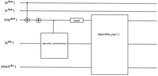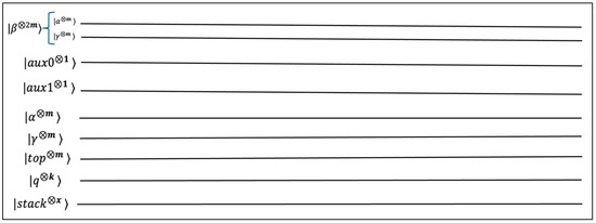 The initial quantum state is prepared for each transition. To prepare this initial state, the inputs needed are the current state vector (q) and the current top element of the stack (top). The transition ‘fa,α’ is defined for all symbols ‘a’ in the alphabet Σ, the stack element to be popped (α), and the stack element to be pushed (β). In our implementation scheme, stack elements represent quantum states represented as binary numbers. The elements to be pushed represented by β = αγ may consist of 0–2 stack elements. The quantum register for β is initialized with 2 m qubits (where m = log(|Γ| + 1)), that is, the first m qubits for and the next m qubits for . Earlier, we defined the possible cases for the transition functions of a PDA. To decide to which case the respective transition belongs, we need 2 qubits, ‘aux0’ and ‘aux1’, which are initially reset to . Based on the inputs of , the ‘Aux’ qubits change. Subsequently, we set up two quantum registers, and , each containing m qubits. We start by resetting all the qubits in the quantum registers of and to |0⟩. Then, if any qubit in the β register is 1, we use a NOT gate to flip that respective qubit in α or from to . These registers participate in change computations.