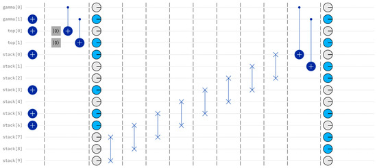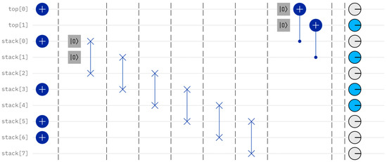 = {ε, a, b}. Elements of the stack alphabet and ε are represented as |ε⟩ = |00⟩, |a⟩ = |01⟩ and |b⟩ = |10⟩. The current stack is assumed to be [a, b, b, a], where the leftmost element, a, corresponds to the stack top. Specifically, Stack[0] and Stack[1] represent ‘a’, Stack[2] and Stack[3] represent ‘b’, Stack[4] and Stack[5] represent ‘b’, and Stack[6] and Stack[7] represent ‘a’. Now, we aim to push an element onto the stack. The quantum circuit given in Figure 9 shows the resulting circuit following Algorithm 7.