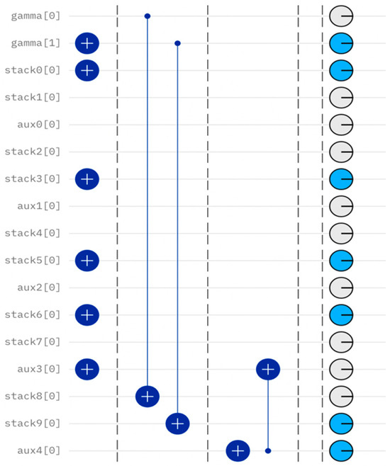 Stack[0] and Stack[1] represent ‘a’, and the auxiliary qubit for ‘a’ is aux0. Stack[2] and Stack[3] represent ‘b’, and the auxiliary qubit for ‘b’ is aux1. Stack[4] and Stack[5] represent ‘b’, and the auxiliary qubit for ‘b’ is aux2. Stack[2] and Stack[3] represent ‘a’, and the auxiliary qubit for ‘a’ is aux3. The qubit aux3 is activated as ‘a’ (the fourth symbol in the list), which is the top symbol.