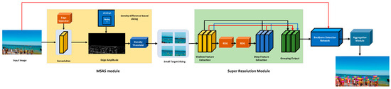 (1) Firstly, in order to improve the problem of loss of target feature information, a method of multi-scale feature information fusion has been proposed [9,10,11,12,13,14]. Considering that multi-layer convolutional networks may result in the loss of key feature information for small targets, extracting features from different dimensions of the detection target by inputting the image into a network model with multi-layer convolution can be used for the final classification of the target. The SSD algorithm proposed by Liu et al. [13] designs a preset anchor box module based on multi-scale feature maps, which enhances the feature expression of small targets using large-scale feature maps with rich texture features. Li et al. [15] used dilated convolutions of different scales to process feature maps, which not only increased the receptive field but also expanded the scale of the feature maps, enriching the feature information of small targets. In addition, for better feature aggregation, Gao et al. [16] proposed a multi-source domain information fusion network, which designs a specific network architecture and mechanism for better feature learning and fewer feature distribution discrepancies, respectively. Moreover, Gao et al. [17] designed a self-learning joint optimization strategy to drive the parameter optimization, which can lead to a better result of parameter fitting. In addition, the loss of target information not only occurs during the feature extraction process but is also limited by the original resolution of the images captured by the monitoring equipment. In most practical scenarios, the original resolution of small targets in the images is insufficient, and the loss of detailed features is more severe. People propose using super-resolution enhancement methods to improve to higher resolutions without changing the original feature rules to restore the feature information of more small targets. Rajan et al. [18] proposed a general interpolation method based on decomposition, interpolation, and fusion steps, while Tao et al. [19] proposed a wavelet domain bilinear interpolation method based on this framework, making the algorithm’s computational efficiency more in line with real-time requirements. The proposal of Swin Transformer [20,21] effectively combines the advantages of multi-scale feature fusion and resolution enhancement, and can generate multi-scale feature maps. By calculating the weights of the self-attention mechanism within local windows, it can effectively reduce computational complexity and preserve target detail information, significantly improving the detection efficiency of small targets.