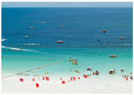 Tiny Person [27] datasets were collected from the network and selected samples from different video series; by abandoning repeat images, the dataset finally had 1610 labeled images and 759 unlabeled images with 72,651 labeled boxes. It contained two types of small target persons, the people from the sea and the people from the land, with some specific rules: