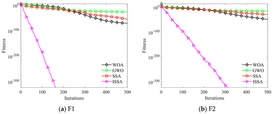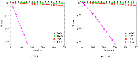 In this study, the experimental platform used was MATLAB R2020b. To assess the ISSA algorithm’s performance, F1–F4 benchmark test functions were selected and the comparison algorithms used were the basic SSA, the grey wolf optimization algorithm (GWO) [30], and the whale optimization algorithm (WOA) [31]. In order to ensure the fairness of the experimental results without interference from the parameter settings or hardware configurations, the same experimental environment was used for all the algorithms compared: 30 algorithm runs, 30 populations, and 500 iterations. The benchmark function parameters are shown in Table 1.