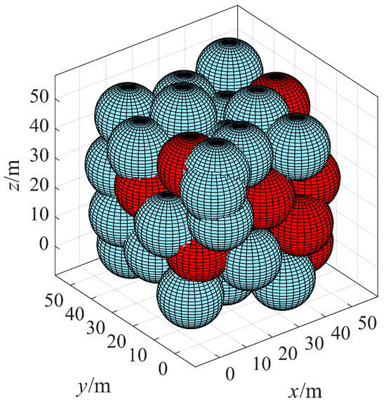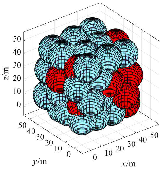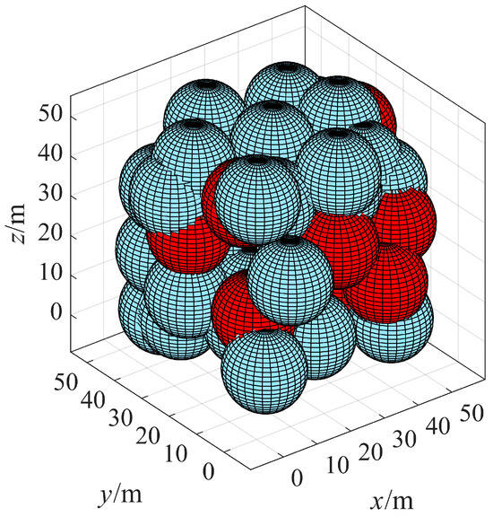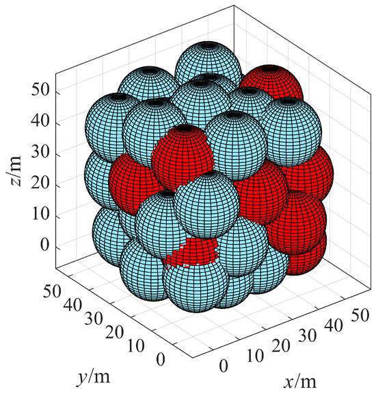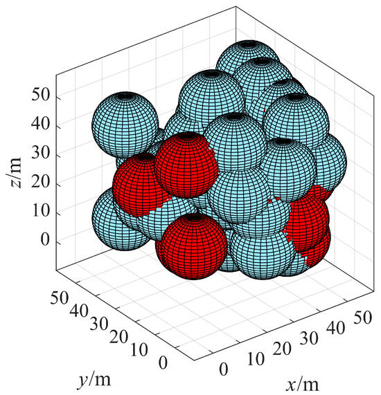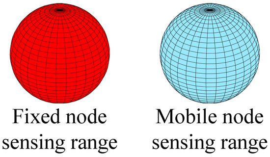 In this experiment, 35 mobile nodes and 15 fixed nodes were set up, and Figure 4 shows the classification of the nodes, with red spheres for the fixed node sensing range and light blue spheres for the mobile node sensing range. Figure 5, Figure 6, Figure 7, Figure 8 and Figure 9 illustrate the node coverage outcomes achieved by the four algorithms. During the initial deployment stage, the nodes were deployed in a randomized manner within the monitoring area. By comparing the coverage results of these four algorithms for the same conditions, their performance differences in regard to real applications can be evaluated more intuitively. Figure 5, Figure 6, Figure 7, Figure 8 and Figure 9 show the initial deployment, WOA deployment, GWO deployment, SSA deployment, and ISSA deployment, respectively. Figure 10 shows the coverage curve of each algorithm.