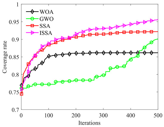 Based on the deployment graphs in Figure 5, Figure 6, Figure 7, Figure 8 and Figure 9, it is evident that the ISSA deployment is the most effective, with fewer coverage holes and more uniform node coverage. The coverage is improved to a great extent, especially when compared to the initial coverage. The coverage of each algorithm is obtained according to Figure 10, where ISSA coverage is 95.59%, SSA coverage is 92.17%, GWO coverage is 90.11%, WOA coverage is 86.17%, and the initial coverage is 75.03%.