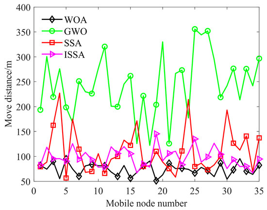 According to the results in Figure 11, the WOA node moves the shortest distance, which is due to the fact that the WOA finds the global optimum earlier and the node position is no longer moving to find the optimal position. The ISSA moves the second shortest distance and achieves greater coverage, with a shorter node-moving distance.