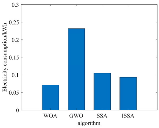 As shown in Figure 12, the electricity consumption of the ISSA is 0.0931 kWh, which is the second largest, which fully proves the advantages of the proposed method in terms of energy consumption.