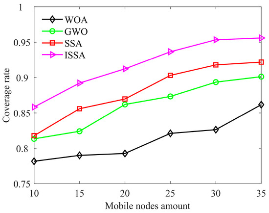 According to the results in Figure 13, the coverage is improved with the increase in the number of mobile nodes for each algorithm. Among them all, ISSA coverage is higher than the other three algorithms.