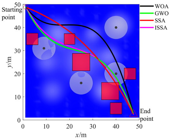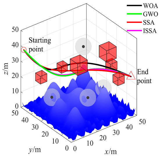 According to Figure 14 and Figure 15, the ISSA path length is shorter than the other algorithms when performing the obstacle avoidance task, and the shorter the path length, the lower the energy usage. Under these circumstances, the ISSA path length is 72.95 m, the SSA is 73.23 m, the GWO is 73.43 m, and the WOA is 78.74 m.