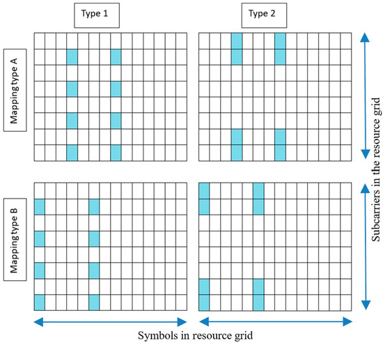 To collect the channel knowledge, the reference signal is allocated in some dedicated resource elements across the transmitted grid. In the 5G NR standard, the reference signal is the DM-RS. The DM-RS provides high flexibility in the transmission configuration to cater to different deployment scenarios. This is possible thanks to multiple configurations in the resource grid. A first classification can be done considering the mapping type in the time domain. For mapping type A, the first DM-RS is located in symbol 3 or 4 of the slot regardless of where the data transmission starts, while mapping type B places the reference signal in the first symbol of the data allocation. In case of rapid change of the channel, additional reference symbols are included in the resource grid in order to ensure an accurate channel estimation. It is possible to configure a double DM-RS structure which supports up to four reference-signal instances per slot. This flexibility is mirrored also in the frequency domain, where two different types of the reference signals can be configured. Type 1 consists of mapping up to four orthogonal signals using a single-symbol DM-RS and up to eight orthogonal reference signals using the double-symbol DM-RS. In type 2, the maximum allowed numbers are six and twelve, respectively. In order to ensure an accurate estimation of the resource grid in both domains for the channel, the two configurations can be combined [20]. Some of the possible combinations are illustrated in Figure 1.
