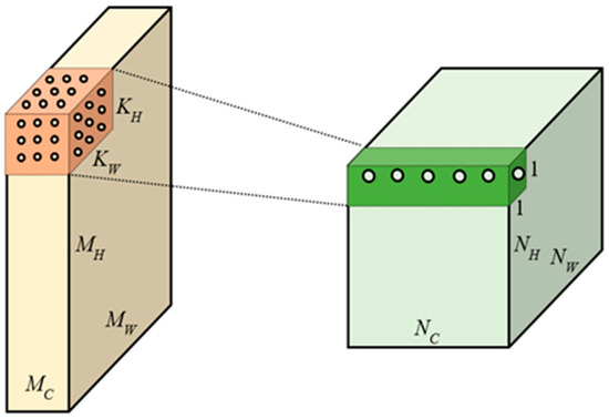 Consequently, the dimension of the current layer depends on the features of the previous layer, where the planar section is defined with the height (MH) and width (MW) of the previously extracted fmaps, and the depth is given by the number of filters (MC), as shown in Figure 4.