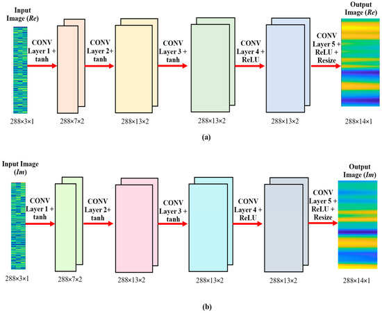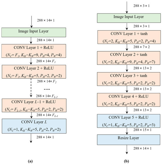 The model reported in Figure 6a receives the preliminary estimation provided by LS and the results are interpolated, increasing the size of the input from 288 × 3 to 288 × 14. The Input Image Layer forwards the input image to the first CONV Layer, which adopts 3-D filters with planar sizes of 9 × 9. Padding sizes are set to PH = PW = 4 in order to preserve the sizes of fmaps. A sequence of L–2 CONV Layers, with L being the number of layers, is stacked throughout the model. Each of them consists of several filters with 5 × 5 planar sizes. Moreover, in this case, the sizes of the generated fmaps are preserved by setting PH = PW = 2. Finally, the last CONV Layer performs the remaining computations to generate the estimated channel. It is worth underlining that the stride SH = SW = 1 throughout the CNN and the Rectified Linear Unit are used as non-linear activation.