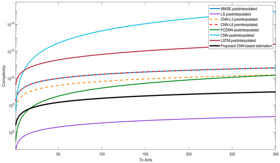 Indeed, the implemented CNNs with pre-interpolation are comparable to the MMSE complexity. Although there is a big difference in number of layers, the computational cost varies by half an order of magnitude. In this range, the FCDNN and LSTM networks presented in [3,8] are included. The growth of the FCDNN complexity is faster than the LSTM, having the number of neurons per layer dependent on the number of antennas in the system.