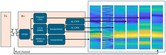 Diagram of the simulated system comparing the channel estimation from the proposed structure with CNNs with pre-interpolation, LS with post-interpolation, and MMSE with post-interpolation.