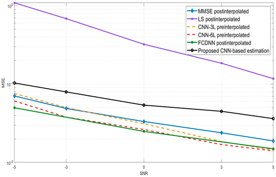At the receiver, the channel information is estimated using five different types of channel estimation designs and compared with the perfect knowledge of the full channel. These are the conventional LS estimation, the MMSE estimation, the pre-interpolated CNN channel estimation with 3L and 6L, and an FCDNN-based channel estimation proposed in [3]. The MSE results are obtained using MATLAB’s 5G Toolbox [26] and are presented in the logarithmic scale in Figure 10.