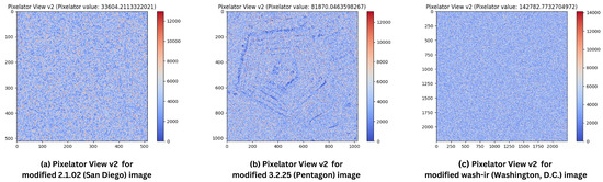 To summarise, the Pixelator RGB Value is computed using the Manhattan (L1) norm, which directly sums the absolute pixel-wise differences between the source and baseline images in RGB space, as shown in Equation (1). This approach emphasizes precise pixel-level differences. For the LAB colour space, the Euclidean (L2) norm is used, as shown in Equation (2), which captures perceptual variations by measuring the overall magnitude of changes in luminance and chromaticity. The combined Pixelator Value, shown in Equation (3), reflects the aggregate perceptual and structural differences between images.