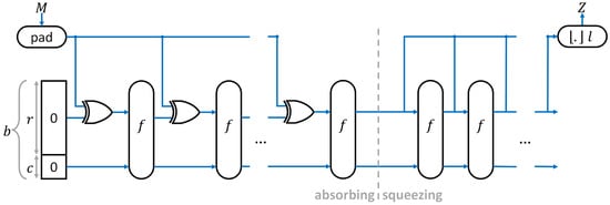 One promising approach for hash-based cryptography involves the use of the sponge construction, a versatile framework primarily known for its application in hash functions like SHA-3 []. The sponge construction operates by absorbing input data into an internal state and then squeezing out the output, ensuring that the process can be tailored to various cryptographic tasks such as encryption, key derivation, and digital signatures, as illustrated in Figure 1. By employing sponge-based designs, cryptographers aim to develop algorithms that can withstand the computational capabilities of quantum computers, thus ensuring the security and integrity of data in the post-quantum era.