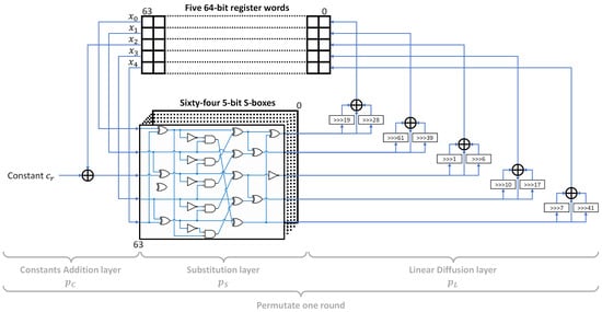 Permutation in Ascon suite has two types: a rounds () and b rounds (). The configured a and b not only determine the amount of iterations that the 320-bit state register S permutes but also the value of the constant to be used in the Constant Addition layer . The 320-bit state S is divided into five 64-bit register words for implementing the round transformations, with , as illustrated in Figure 2. The general operations are explained as follows.